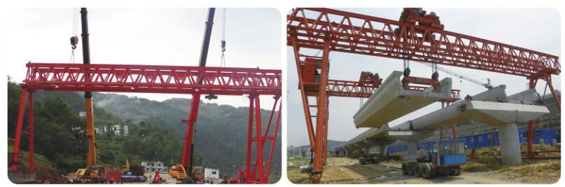 提梁機的功能:提梁機既可兩臺配合抬吊預制梁,也可以單臺起重機配雙吊具起吊預制梁,兩臺同時起重的提梁機各自的起重量一般為 450 噸,單臺起重的提 梁機起重量通常可達 900 噸。它配置支腿行走、天車行走及天車起吊設備,可以實現機械化動作。主要用于將預制梁從制梁臺提吊至存梁臺位,預制梁養護 完成后將其從存梁臺位吊運到運梁車上。作為起重設備完成架橋機的組裝和拆卸。還用于架設墩身不高的旱橋。